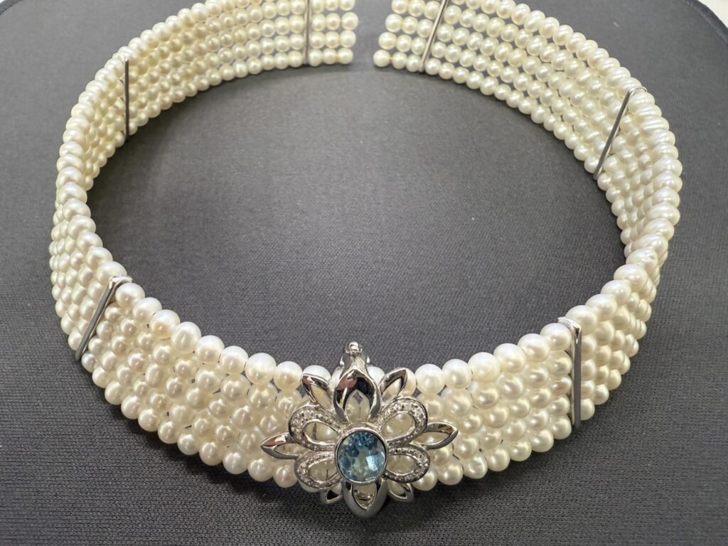 こちらのアクセサリですが、K14WGの貴金属が使われておりさらにベビーパールが5連もつかわれているお品物となります。